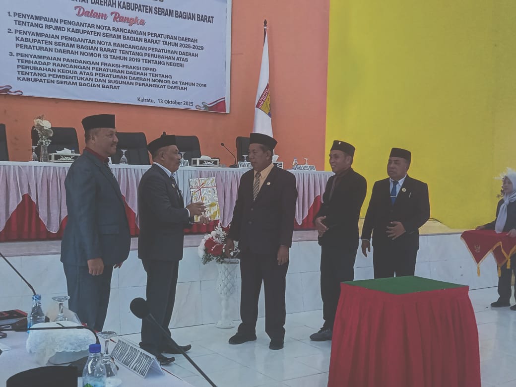 Piru, Demokrasi Maluku ; Dewan Perwakilan Rakyat Daerah (DPRD) Kabupaten Seram Bagian Barat (SBB) menggelar rapat paripurna dalam rangka penyampaian nota pengantar Rencana Pembangunan Jangka Menengah Daerah (RPJMD) Kabupaten SBB Tahun 2025–2029.