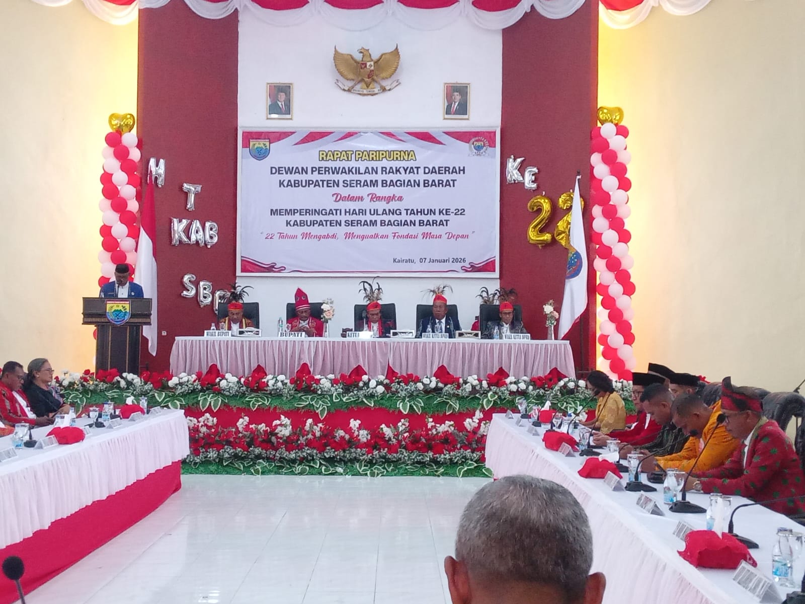 dalam Paripurna yang mengusung tema” 22 Tahun Mengabdi Menguatkan Fondasi Masa depan ” itu, Bupati SBB, Ir Asri Arman MT, Wakil Bupati SBB, Selfinus Kainama S.Pd, Ketua DPRD SBB, Andarias Hengky Kolly SH, Kejari SBB, Anto Widi Nugroho, S.H., M.H.,Dandim 1513/ SBB, Letkol Jaka Putra Dinda, Sekda SBB, Alvin Tuasuun SP M.Si, Para Tokoh Pemekaran Kabupaten SBB, para Mantan Bupati dan Wakil Bupati Kabupaten SBB, Para Mantan Sekda, Para Staf Ahli, Asisten Setda dan Para Pimpinan OPD di lingkup Pemda SBB.